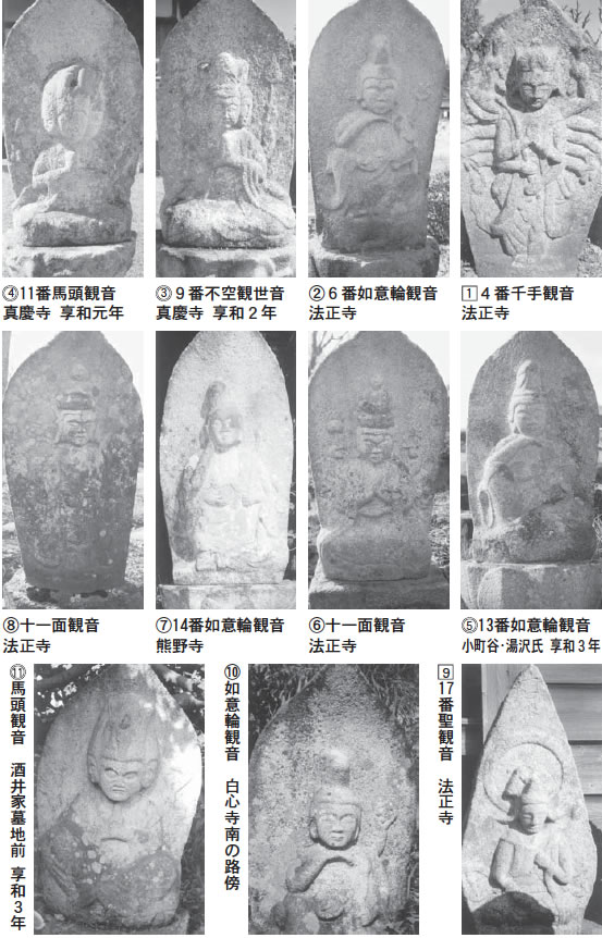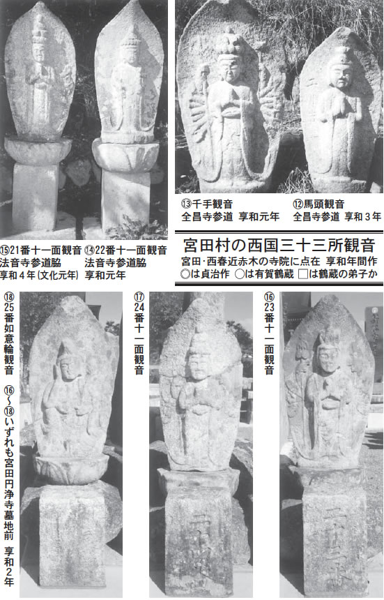 現存する石仏群は、調査の結果18体が各地寺院境内の参道周辺に散在している。舟形光背の頂部に□番の刻字が見られ、西国三十三所観音として造立したことが推定される。大多数を西春近村表木の石工である「有賀鶴蔵」が彫造しているところから、この事業の請け元と推察され、約8割方を有賀鶴蔵がこなし、守屋貞治は6体を分担している。もう一人鶴蔵の弟子と思われる石工作品が諏訪形の法正寺参道より2点見いだされている。全体の6割残存の現状では推測の域を出ないが、不明の4割の石仏も有賀鶴蔵の彫造と思われるのである。
