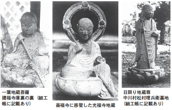 「延命地蔵大菩薩守屋貞治作願主鉾持町藤源、建福寺へ奉納する。文政年代、五十歳代彫像」。この説明にある願主鉾持町「藤源」の石仏は、木曽郡楢川村奈良井の長泉寺にあって、建福寺石仏は一葉地蔵であるという。