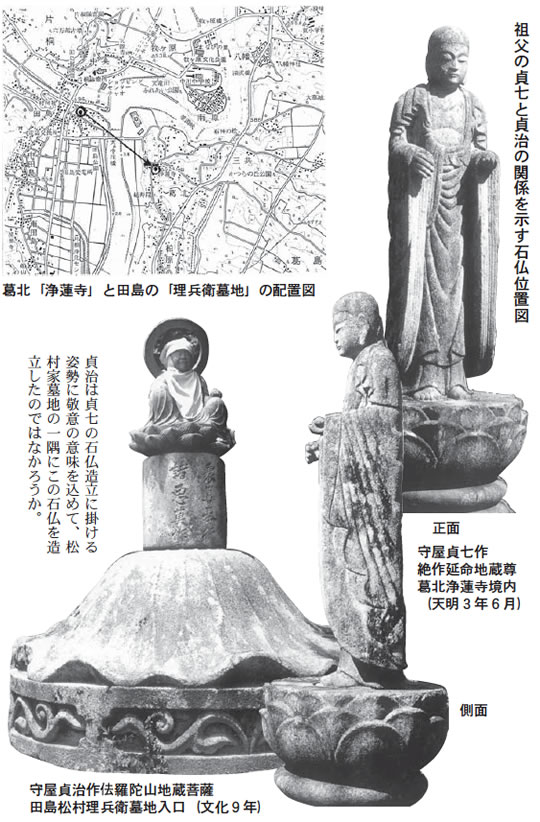 守屋家石工三代に連なる重要な場所が、中川村田島の 松村理兵衛墓地入口であり、先記した「青面金剛」 像と その左隣にある「 佉羅陀山地蔵菩薩」 造立に思いが込め られていた。貞治自身の彫造に掛ける意気込みを、祖父 貞七に誓う、とても意味ある場所であったと思う。守屋 貞治研究の重要地点であって、貞治と松村家の関係が読み取れる。なぜならば、研鑚期の始まりを宣言するかの ような、青面金剛と、円熟期の開始を告げるかのような 佉羅陀山地蔵菩薩の2体の造立は、貞治と松村氏の創作 の意向が合致しないとあり得ないからだ。この考えに至っ た動機については、祖父貞七の最晩年である天明3年記 銘の延命地蔵尊の等身大に彫造された立派な作品を、天 竜川対岸葛北の浄蓮寺境内より見出したことに由来する。 貞七の絶作と思われるこの作品を、感動を覚えて鑑賞し たであろう貞治は、この浄蓮寺より西に1キロメートル 離れた松村家墓地の一隅に、前記2体の石仏を造立した と考えたい。
